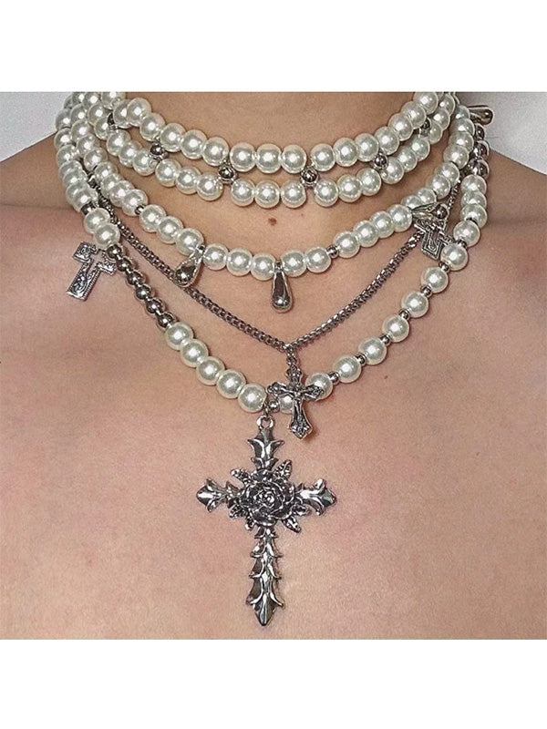 Vintage Pearl Cross Necklace Multilayer Pearl Cross